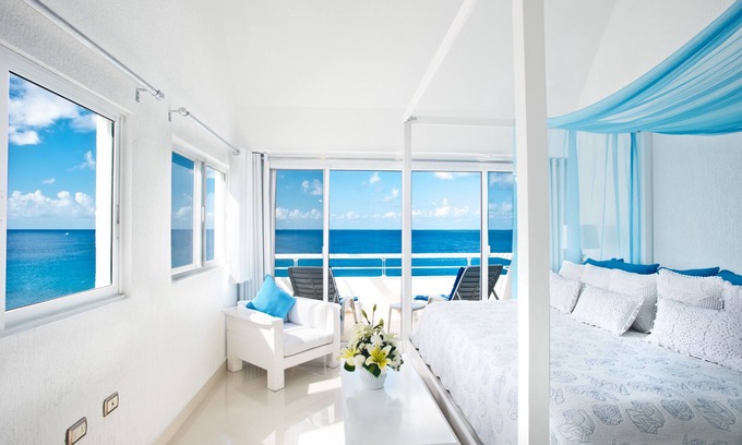 This two level, two bedroom, three bathroom condo has the BEST OCEAN VIEW in the entire building. The Santorini’s inspired blue and white decorations blends in perfectly with the beautiful Caribbean Waters. Bring your laptop: now with wireless internet!