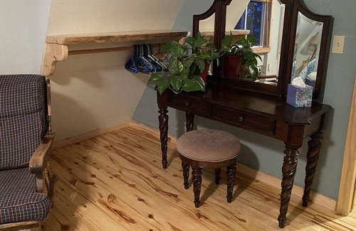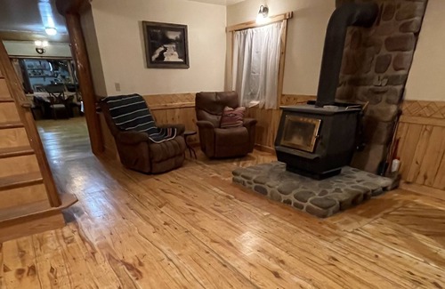 Great room provides a cozy wood stove, recliners, reclining couches, a huge desk with ergonomic chair, additional farmhouse dinning table and even a super comfy double bed. Also lots of books and board games and a Yamaha Bluetooth sound bar. 42” smart tv.