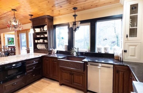 Walking into this large home, the first living room’s 13 foot windows shower you in warm sunshine. As it gets cooler, this living room has a gas fireplace to warm up with, and ample cozy seating.