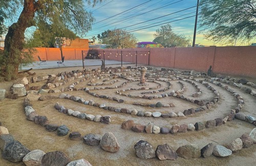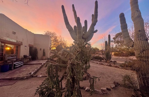 The interior highlights hand-carved Mexican wood furniture and striking desert-inspired art throughout. Multiple patios invite you to soak in the Tucson climate, while the backyard presents unique amenities, including a basketball court, a private yoga studio (fully equipped with mats and props) for moments of tranquility, and a meditative rock labyrinth for spiritual reflection. For those seeking deeper wellness experiences, optional yoga classes, tea ceremonies, and reiki healing sessions are available through our local host.