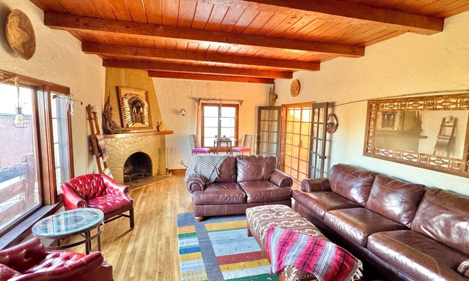 The 'Mud House' is a historic gem crafted by renowned architect Joesler using traditional burnt adobe construction. This charming home features a spacious two-bedroom, one-bath layout that showcases unique architectural elements like graceful arches, original hardwood floors, and lofted ceilings. The primary bedroom includes a king bed, while the second bedroom has a queen bed, comfortably accommodating up to four guests.
