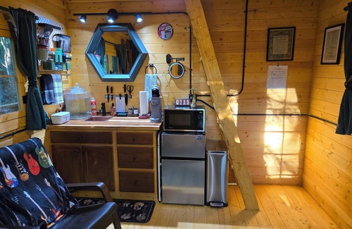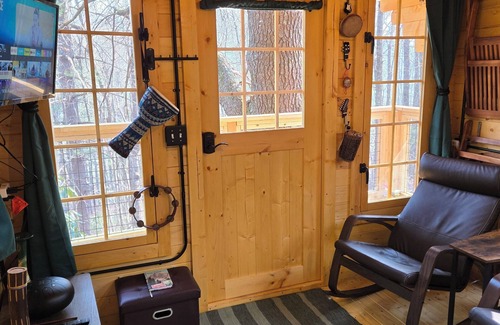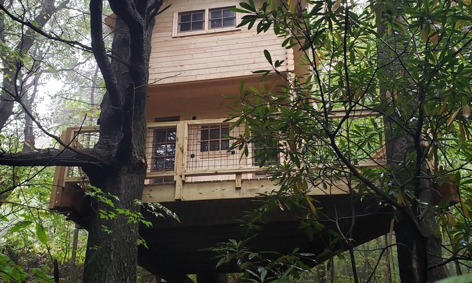 Escape to the Music Box treehouse in picturesque Zirconia. This adorable property features 1 bedroom with a cozy queen bed, perfect for a romantic getaway. Relax among the trees and let your worries melt away. Enjoy this cozy and comfortable treehouse while you listen to the sounds of nature. This 25 acre property has a stream, pond, and multiple hiking trails. You can see the pond from the deck of the treehouse. Enjoy your morning coffee while sitting at the bistro set on the deck. Experience what Zirconia has to offer with a stay at our treehouse.