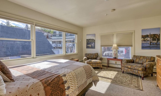 The Nathaniel Bowditch is a gorgeous 2nd-floor corner room with a queen bed, full bath, hairdryer, tv with cable, free wifi, microwave, small fridge, cozy sitting space, and a large window overlooking stunning harbor views allowing for the ultimate peaceful oceanside relaxation. Just a few steps outside and you have access to a semi-private deck to soak up the sunshine and rest.