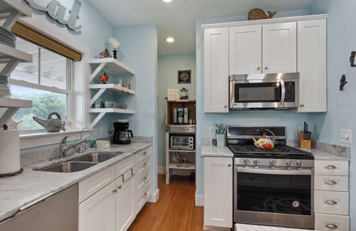 Up to the 3rd, top level you find the deluxe kitchen is equipped with a large granite island & bar seating for 3, stainless steel appliances, a gas stove, and Jura gourmet espresso/cappuccino maker. Of course, there is also a traditional drip coffee maker for the purists. The gas grill is on the porch of this level for the grill master to enjoy.