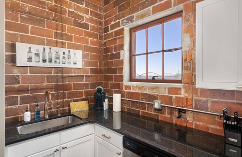This historic building has been repurposed into amazing apartment lofts featuring granite countertops, sealed concrete flooring, subway tile surrounds and exposed brick walls. The river views and modern industrial vibe make for a totally unique experience.