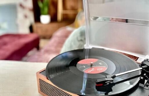The beautifully curated sitting area offers gorgeous artwork, a comfortable plush couch, swivel chair for perfect TV viewing, vintage armoire for clothing storage, stocked bookshelves, record player with albums for you to enjoy as well as a smart TV that can be viewed from the comfort of the bed, sitting area or dining area. The smart TV has access for you to log in to your account with most of the popular streaming services.