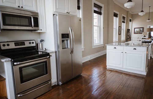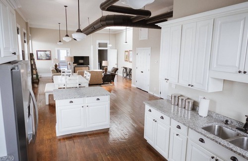 Welcome to The Nest, Henderson's finest loft! This Victorian 1800 sq. ft. loft is newly renovated, fully furnished and nicely appointed in the heart of Downtown Henderson. The huge living room is perfect to meet friends, watch TV, cook, or just gaze out the massive windows. The Master Room, Reading Room (featuring a queen Murphy bed), fully equipped Kitchen, and Private Patio are quiet spaces to relax, work, prepare a meal, or plan your day. Parking, fast wifi, and washer/dryer all included!