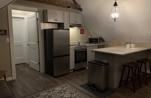 The Nest is a newly renovated apartment with attention to detail showing exposed beams, vaulted ceiling, and hardwood throughout. This quiet rental has a full granite kitchen with peninsula, living area with sectional couch comfortable enough to sleep an additional guest, full bath with tub and a washer and dryer. The newly remodeled apartment located in downtown Freeport sleeps 4 comfortably. The bedroom has a queen bed and twin with trundle. The large sectional couch is perfect for relaxing and there are doors to separate the spaces. The Nest is perfect for a small family, romantic getaway, or shopping weekend with friends. There is a large HDTV w/cable in the living area as well as in the bedroom, as well as wifi, efficient heat and AC for your comfort. All linens are included. The kitchen has a peninsula with seating, refrigerator with freezer, oven, microwave, dishwasher, coffee maker, blender, linens, pots, pans and dishware. Pack n Play with linens is available as well. Let us know if we can set that up for you! Nearby Bow Street Market has "Bow To Go" as well if you wish to have your groceries awaiting you at Bow Street Market. We live in town so please let us help make your stay enjoyable with local tips, directions, information on events, hiking and biking routes or area must see attractions.