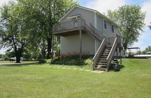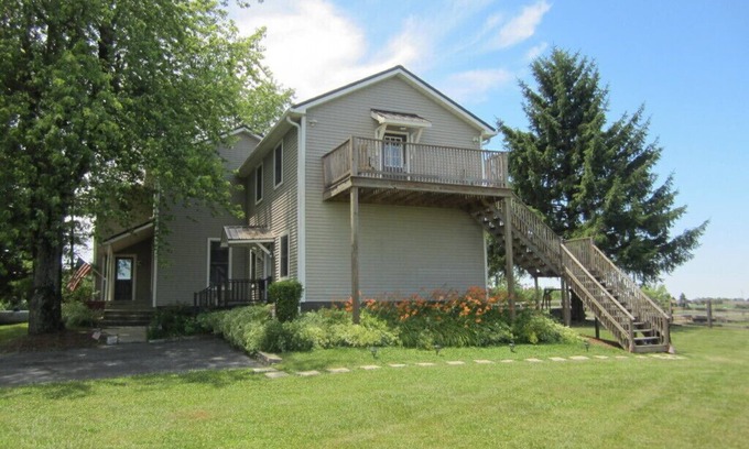 Welcome! Enjoy the country views from your exclusive second story deck or relax inside of your isolated, spacious, and peaceful studio apartment. Complete with a King size bed, loveseat, recliner, 55” TV, full kitchenette, walk in closet and private bathroom. Updated, clean, and secure. Arriving late? Solar and motion detector lights along with a lighted electronic key pad for ease of access. Please note there are 23 steps with rails on both sides and a landing area half way to the apartment.