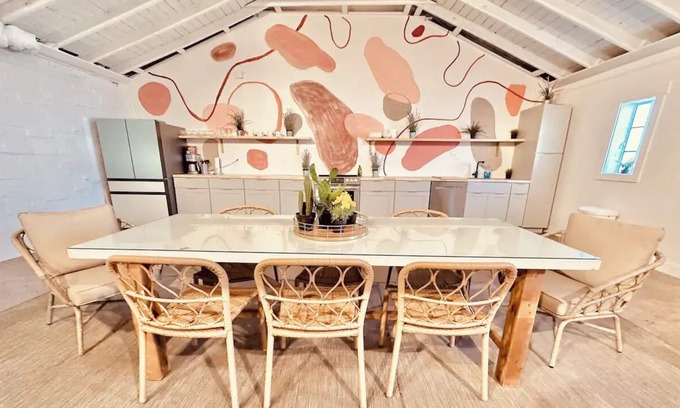 Beyond the bedrooms, the house unfolds with a bright living room, a well-equipped kitchen, and a dining area primed for shared feasts and lively chats. Unique artworks and designs pepper the space, from striking monochrome photos to handcrafted wooden furniture – it's a visual feast!