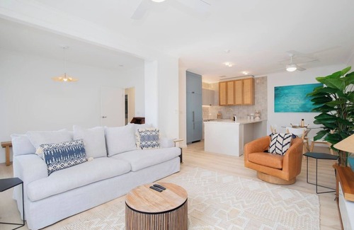 After a day of surfing or seaside strolls, retreat to two beautifully styled bedrooms, where warm coastal décor, queen beds, and crisp linens promise a restful night. The main bathroom invites you to indulge in a deep soaking tub, while the second bathroom’s spacious walk-in shower offers a refreshing way to start or end the day. Keep your wardrobe fresh with the in-unit washer and dryer, perfect for extended stays.