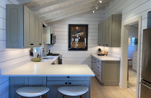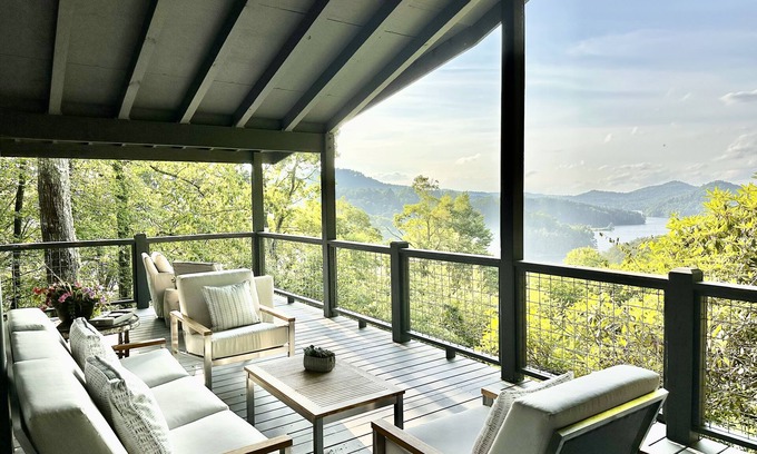 When you enter The Nut House you will be captivated by the view and all the natural light. The vaulted, beamed wood ceiling and hardwood floors set the tone to frame the beautiful lake and mountain view. The living room opens to a wrap around porch and an inviting seating area with comfortable Barlow Tyrie and Lee Industries outdoor furniture. The kitchen boasts painted and glazed cream cabinets with GE Cafe Gas Range and appliances, quartz countertops, and cookware such as All Clad and Le Creuset. With lots of outdoor and indoor living spaces, The Nut House, has 2 Bedrooms, Bunk Room and 3 full Bathrooms to sleep 8. The master bedroom is located on the main floor with a king size bed appointed with cozy and luxurious linens. The master en suite is exquisitely finished with a walk in shower, large closet and sliding glass door to the expansive wrap around porch. The guest bedroom is located downstairs with its own private bathroom and the bunk room has two twin bunk beds and sitting area. The cottage is equipped with four Smart TVs, one located in the master bedroom, bunk room as well as the living room and the covered porch. This cottage features designer furnishings, hardwood floors, ten foot ceilings, a gas fireplace and last but not least the outdoor smokeless fire pit overlooking the lake- the perfect spot for a family smores' night.