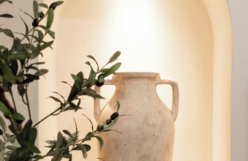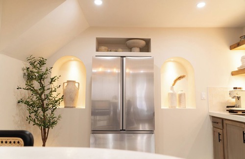 The Mediterranean-inspired kitchen blends style and function, featuring all-new high-end appliances, open shelving, and sleek finishes designed for effortless cooking and gathering.