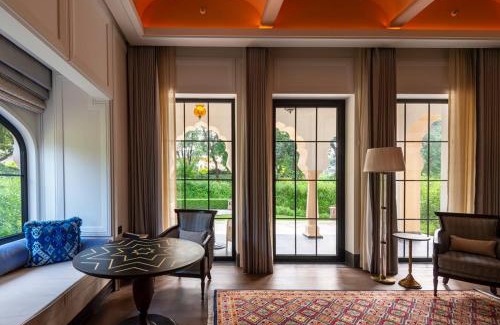 Elegant Accommodations: The Oberoi Rajgarh Palace in Rājgarh offers luxurious rooms with air-conditioning, private bathrooms, and modern amenities. Each room features a balcony or terrace with garden or lake views, ensuring a comfortable stay. Exceptional Facilities: Guests can enjoy a rooftop swimming pool, spa facilities, sauna, fitness center, and a lush garden. Additional amenities include a terrace, restaurant, bar, and free WiFi in public areas, catering to all leisure needs. Dining Experience: The resort offers a family-friendly restaurant serving international cuisine with halal, kosher, vegetarian, vegan, gluten-free, and dairy-free options. Dining options include brunch, lunch, dinner, high tea, and a child-friendly buffet. Prime Location: Located 11 mi from Khajuraho Airport, the resort is near attractions such as Lakshmana Temple and Kandariya Mahadeva Temple, each 9.9 mi away. Yoga classes and walking tours are available for guests to explore the surrounding area.