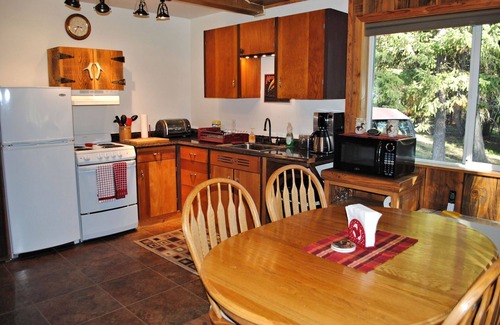 Kitchen has a refrigerator, electric stove w/ oven, microwave, toaster oven, and a 12 cup coffee maker. Dishes, glassware, flatware, cooking utensils, coffee mugs, pots & pans, storage bags and containers, paper towels; all provided.