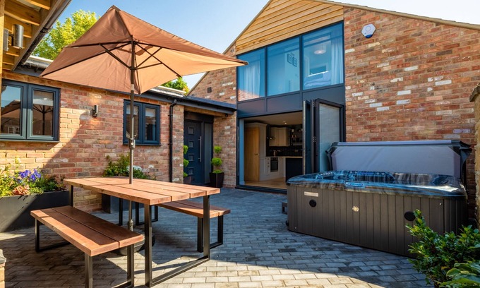 Enclosed south facing courtyard garden, Jacuzzi hot tub, bench table with seating for six people and a parasol, charcoal BBQ (guests to provide own coal and clean the BBQ after each use)