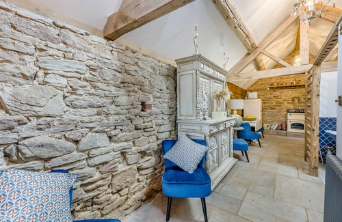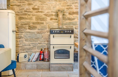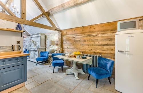 Feel the authentic charm and age of this beautifully curated barn conversion as soon as you step into the completely open plan, single level arrangement. As you stand on the stone floor in the spacious kitchen and dining area, marvel at the impressive A-frame oak beams and exposed stone walls that run the length of the property, imagining how the building once housed cows on the farm, many centuries ago. Attention to sustainability is evident throughout your stay, with recycled materials used for the kitchen units and reworked quality furniture. A traditional farmhouse style kitchen provides ample space and equipment to cook up a romantic meal for your loved one, with locally sourced produce purchased from nearby Ludlow. Moving down the property, a quirky, stylish bathroom with traditional roll-top bath; a classic feature that exudes sophistication, is a seamless extension to the open plan living space. A privacy screen made of traditional oak beams offers a sense of seclusion without disrupting the unique, airy feel for the space. The WC however, is closed off beyond a solid wood, lockable door. Unwind in a relaxing bubble bath after a long day outdoors or use the handheld shower as a quick wake me up before a busy day of adventuring. Large sliding doors at the end of the property invite the beauty of the outdoors inside, allowing you to marvel at the stunning countryside views from the comfort of the plush sofa in the living area, or to accompany a lazy morning in your king-size bed with a freshly brewed coffee. In the colder months, close the doors and let the traditional wood-burning fire in the corner of the room warm you up while still enjoying the beautiful views that make you feel connected to the outdoors.
