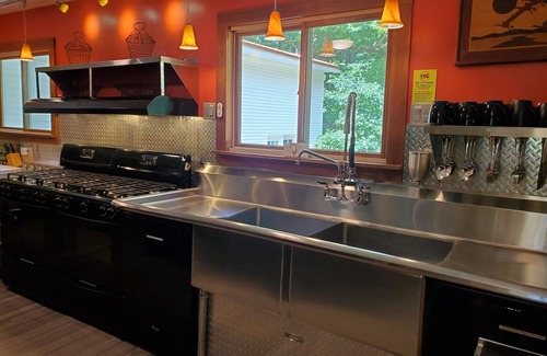 Easily accommodates 20-25 overnight guests with privacy. Private, wooded setting in the Manistee National Forest. Commercial style kitchen with two ranges, two refrigerators, two ceiling fans and two dishwashers. All cookware, utensils, paper products and linens provided - just bring your toys and your treats. Parking on-site for up to 20 vehicles, including room for several boat trailers.