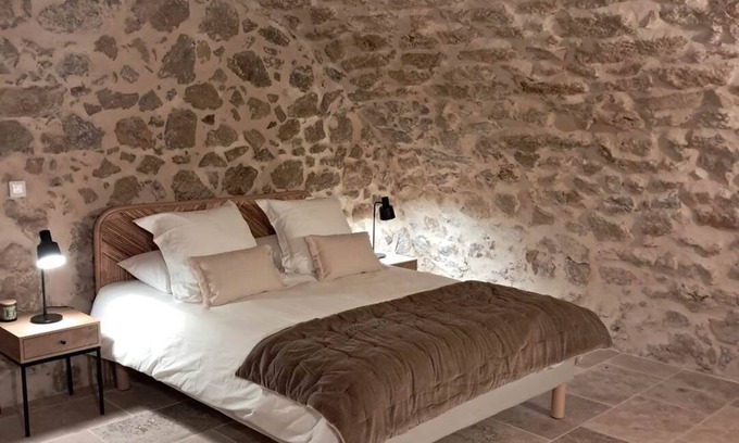 The "old discotheque" suite is located on the banks of the river in the Vieux Moulin property. This suite/apartment of approximately 90 m2 houses a large vaulted stone bedroom, a fully equipped kitchen, a bathroom with a walk-in shower, a large living/dining room, and an independent outdoor terrace. Designed to be a cocoon in a green and serene setting, this historic space is housed in a former discotheque from the 60s/70s where many of our favorite French and foreign actors came to dance (Alain Delon, Romy Schneider, Pierre Richard, Maurice Roné, Patrick Dewaere, among others...)