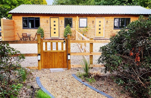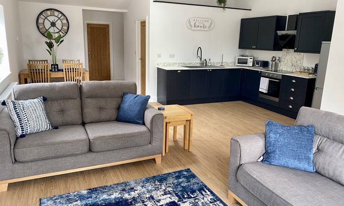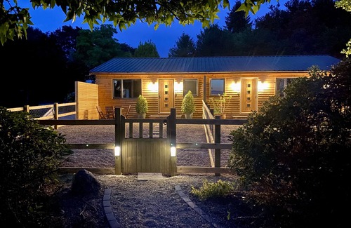 Our brand new conversion of Lodge one has a beautiful exterior of cedar cladding. There is a small step up into the property, once inside everything is ground floor level. You enter into a large open plan living/kitchen and dining area. The living area is very spacious and flooded with light thanks to the vaulted ceilings and roof windows. Immediately as you walk in we have a utility/boot room with a washing machine for you to use during your stay.