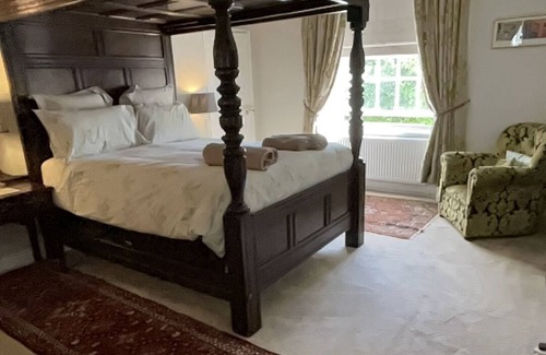 The old rectory is set in 2 acres of garden and orchard .Oak paneled formal dining room 2 sitting rooms 1 of which is paneled with beautiful fireplace and log burner use of kitchen & breakfast room Jacobean staircase beams and period features. Situated in a quiet private lane with driveway with ample parking .Bedroom available has 4 poster oak king size dbl bed dressing room en-suite bathroom with seperate walk in shower situated at the top of own staircase which makes it private.