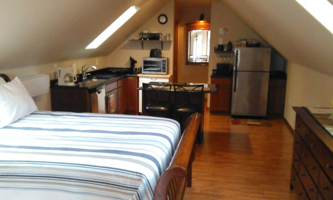 Incredible 480 sq ft studio that has a queen bed with a very expensive queen pillow top mattress, all stainless steel appliances, Washer/Dryer, black leather reclining love seat and black leather