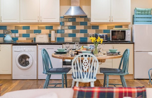 Kitchen is well equipped with cottage style units with sink, fridge/freezer, microwave, a four ring electric hob and oven beneath, dishwasher, washing machine, Nespresso coffee machine.