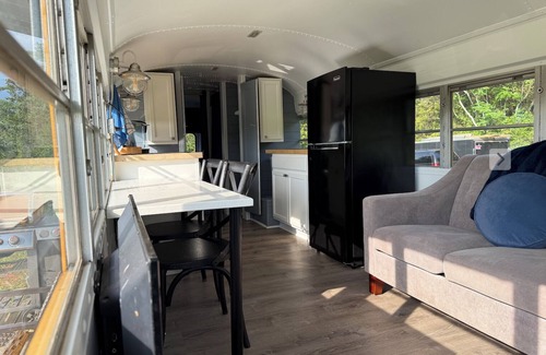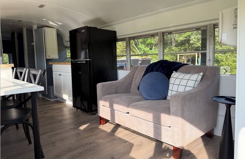 Nestled on a peaceful property just a 15-minute walk from stunning Lake Hartwell, this one-of-a-kind stay offers everything you need to unwind, recharge, and have some fun. Inside the bus, you’ll find a surprisingly spacious layout with one comfortable bedroom, a full bathroom, and a thoughtfully designed living space that combines rustic touches with modern amenities. Whether you're relaxing indoors or sipping a drink outside on your private porch, you'll feel right at home in this creative and inviting space.