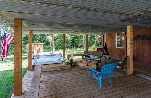 This amazing 2 bedroom, 2 bath cabin is fully equipped and ready for short or long-term visits. Cabin has a strict outdoor ONLY smoking policy to accommodate all of our guests. One bedroom has a full bed and a queen bed with a clawfoot tub/shower combo private bath, the second bedroom has 2 sets of single bunkbeds and one single bed (5 twins total) with private bath/shower and washer & dryer. Sofa in living area makes into a full bed also. Plenty of room to sleep 11. Kitchen is fully equipped with electric stove, full fridge, microwave and dishwasher. All rooms have flat screen TV's with Direct TV. Central heat & air. The fully covered front porch has a hot tub, swing and plenty of seating, there is a fan for those long hot summer days and a mosquito mister surrounds the cabin to keep those pesky bugs at bay. There are 2 BBQ pits available and a firepit for perfect s'more toasting. Make time to relax in the hammock overlooking the lake.