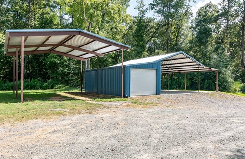 There is a covered 50 AMP RV spot available or you can use that spot for covered parking. There is plenty of parking and 23 acres to roam. The shop has fish cleaning station with a covered, concrete picnic area.