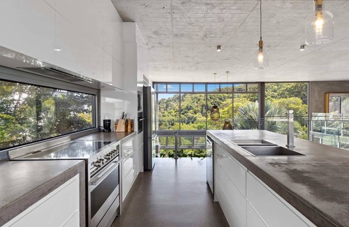 The kitchen, dining and master bedroom are located on the entry level of the home. Boasting beautiful views of the indoor garden wall and the exquisite exterior outlook, the kitchen is fully equipped with quality appliances including a dishwasher, electric stove/oven, microwave, coffee machine and family sized fridge. Furnished with polished concrete, the kitchen and dining area is complete with plenty of seating such as a dining table fit for up to eight people.