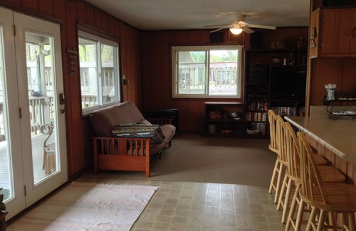Rustic, clean and welcoming cabin with three bedrooms, well-appointed kitchen and two common areas. Each living area has a futon that converts to a full-size bed for additional sleeping. There is a full bathroom with tub/shower. The second bathroom with shower is in the adjoining structure in the Pavilion. There is an additional large sink in the Pavilion.