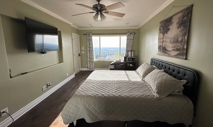 Escape to this serene hilltop retreat with breathtaking views of LA! This spacious suite features a king bed, 60" TV, ample closet space, a private full bathroom, and a kitchenette with complimentary coffee. Includes one designated parking space. Guests have access to shared laundry room and backyard. This peaceful haven offers the perfect mix of relaxation and convenience—just a short drive to LA, beaches, and top attractions. Access to the suite requires walking downstairs.