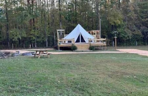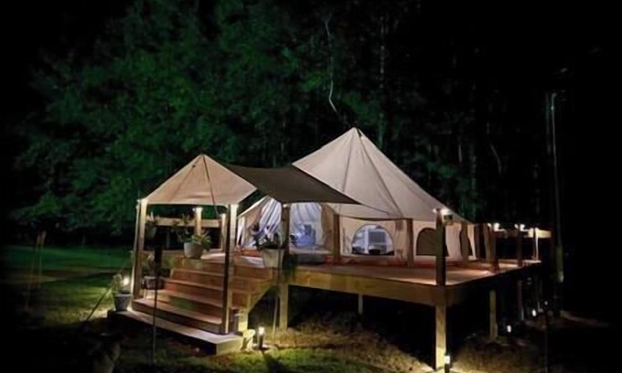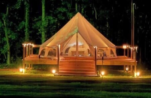Let the symphony of native owls lull you to sleep when you stay in this luxurious 320 sq. ft. Avalon bell tent. Built for the ultimate glamping retreat, this experience includes a fully equipped modern outdoor bathroom and shower. Enjoy the comforts of a temperature controlled climate, mini vintage Frigidaire refrigerator/freezer, single-cup pod Keurig coffee maker, and extra large fire pit. Guests can enjoy over two acres of nature with an accessible 40,000sf pond for paddling and fishing. Save yourself from the packing list because the Owl's Nest has it all.