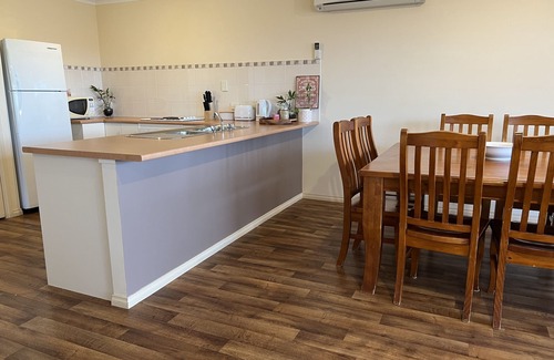 12 Schick street, Loxton is just a few minutes drive from the Murray River. This 4 bedroom, 2 bathroom property with open plan kitchen dining and family room has lots of room for everyone with a second living room with couch and TV. Sleeping 8 adults comfortably with only 2 people per room. If you have a larger family than 8 we do have other sleeping option available upon request. Heaps of off road parking for the boat, caravan or both, on a quite street. Linen is included in the price so if you arrive late you can crawl into a comfy bed and saves you all the washing when you get home. Linen includes pillows, doona, sheets, towels and tea towels. Unlimited WiFi, Reverse cycle air conditioner/heating in living area and ceiling fans in all bedrooms. Kangen Water share available on request. Porta cot and portable high chair available. BBQ and out door seating makes the back deck a lovely place to enjoy the day.