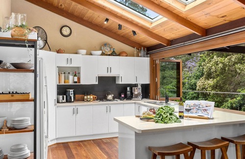 A truly versatile kitchen with modern appliances including gas cooktop, dishwasher, family sized french door fridge and coffee machine has you set to create lovely meals during your stay. Pick some herbs or greens from the vege plots on offer and open the concertina windows to the outside verandah while creating holiday memories that will last a lifetime. The covered deck works seamlessly to incorporate outdoor dining with easy flow to and from the kitchen and indoor living spaces.