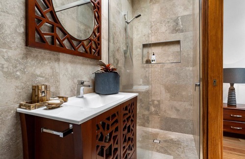 Four stylish and comfortable bedrooms, one on the lower level accessed by a sandstone path that winds through the garden - two with ensuite bathrooms opening to decks and terraces.