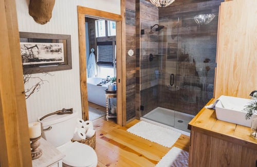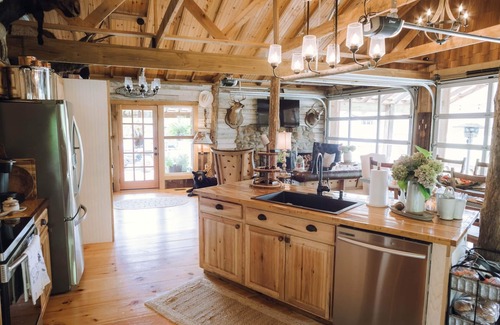 Every detail of The Party House has been carefully curated for your comfort. Crafted from reclaimed wood and outfitted with luxury furniture and appliances, The Party House is an inviting space where you can rest and recharge and spend time with family and friends. The décor and details of the home are inspired by the surrounding East Tennessee area and pieced together in a way that gives the home sophisticated rustic charm. Wake up to the sounds of nature, pour an espresso and open the full-size garage door walls to let the morning air welcome you to your day at Bear Creek Lodge.