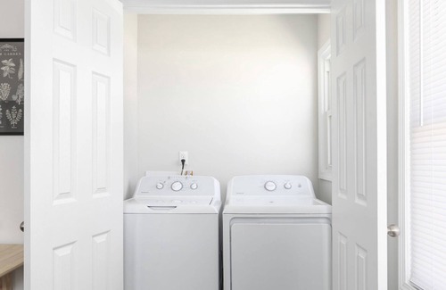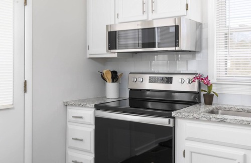 The brand new kitchen features granite countertops, stainless-steel appliances, and a farmhouse sink. The kitchen is well equipped with dishes, silverware, pots, pans, a coffee maker, kitchen utensils, storage containers, and other essentials. There is a drop-leaf, eat in kitchen table that can seat up to 4 people. Additional chairs are located in the living room closet. The washer and dryer and enclosed in a laundry closet off the kitchen.
