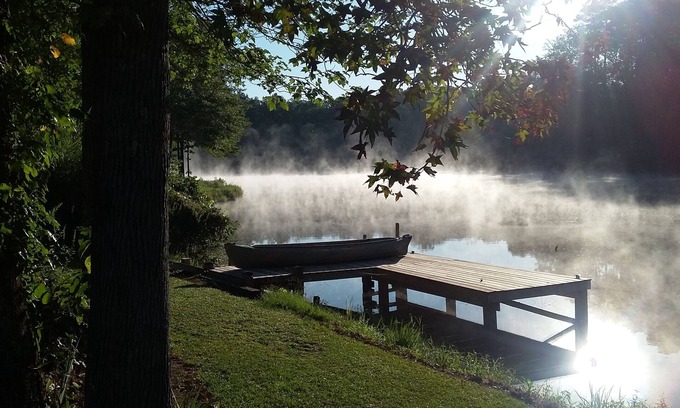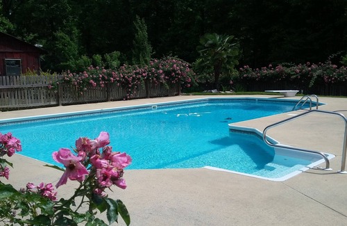 *AMENITIES - 3 acres with access to the front meadow, a seasonal stream, the dock overlooking a 6-acre lake, fishing, pool, & fire pit. The quiet, respectful use of these is available from 9am-9pm.