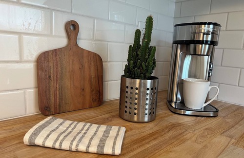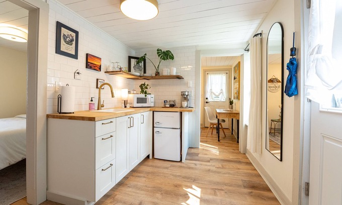 The Peach Door Annex is a sweet, private one-bedroom suite with kitchenette, attached to the rear of Parkview Cottage. Perfect for solo travelers or couples looking for a romantic getaway. This stylish suite is centrally located in the heart of Youngstown, just a short walk to local restaurants, shops, and the free shuttle to Niagara Falls. Take a 15 minute leisurely walk to Fort Niagara State Park or a short 20 minute drive to Niagara Falls State Park.