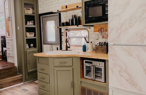 you’re provided with a full size refrigerator, portable two eye induction cooktop , toaster oven that does it all, farmhouse sink, coffee maker, microwave, pots , pans silverware, basic cooking utensils and beautiful wooden countertops.