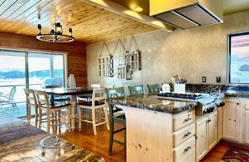 This upscale cabin is perfect for the whole family! Inside you'll be welcomed into a spacious entry/mudroom area to leave the outdoor fun from the day. The large family room has tons of comfortable seating to enjoy a crackling wood fire, play some board games, or watch your favorite team! Slide open the glass doors to walk out onto the covered deck with amazing views of Panguitch Lake.
