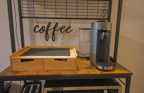 You will find a kitchen stocked with all basic amenities, a Nespresso coffee machine, coffee pods, & creamers! You may enjoy dinners at the kitchen table.