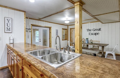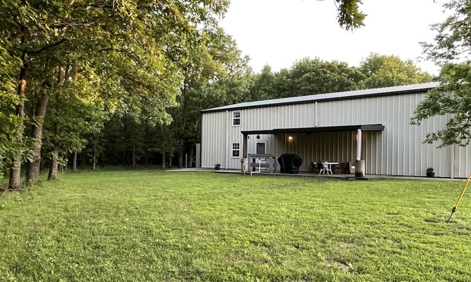 Enjoy this barndominium after a long day of hunting, fishing or boating. Wake up and sip your coffee on the covered patio while watching the wildlife stroll by or watch the sunset while enjoying the fire pit. Hike the 14 acres, enjoy the fish you caught by using the cleaning station and grill. Whether you need a couple's getaway or have a family gathering, we can accommodate you as this home sleeps up to 8. On the main floor there is plenty of room for everyone at the large farmhouse table or in the sunroom. Cook up a delicious meal in the rustic kitchen while visiting with family or friends with the open concept space. You can also find one bedroom and the full bath with a walk-in tiled shower and double vanities on the main floor. Upstairs there are 2 bedrooms and a large family room with a sectional that includes reclining seats while you enjoy your favorite movie or tv show. There is a shower in the garage and an outhouse with a working toilet that is convenient for hunters. There is lake access in the neighborhood 1 mile away via old corp of engineers road/boat ramp (road is a little rough). From The Great Escape you are only 7.5 miles to Long Shoal Marina, 9.5 miles to Bucksaw Marina, 12 miles to Truman State Park Marina, and 15 miles to Warsaw.