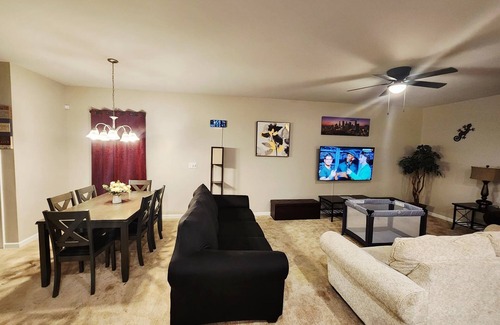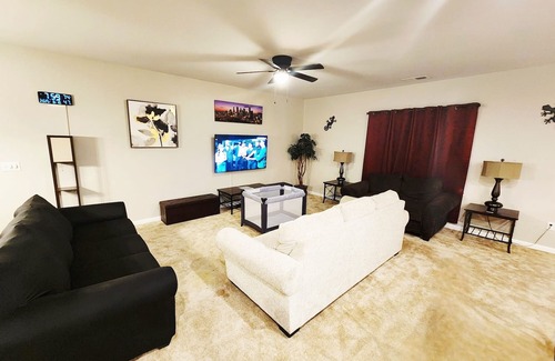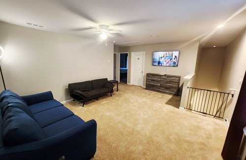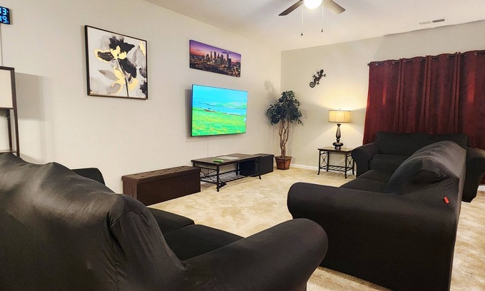 Find your cozy and accommodating family retreat in McDonough GA, easily reachable within a quick car ride to some of Atlanta's top thrills: Atlanta Motor Speedway, Southern Belle Farm, Heritage Park, Veterans Wall of Honor, Panola Mountain State Park, Sky Zone McDonough & Urban Air Adventure Park and many other attractions and activities. Explore the shops, and historical buildings around the town or spend some time relaxing at your vacation paradise enjoying delivery from the local restaurants. This is beautiful home with modern conveniences and plenty of sleeping space for adults, children and babies. On the second floor, this home features a main bedroom with king-size bed, convertible futon, full-size crib with changing table, laptop desk with chair and ensuit bathroom with dual sink, tub and shower, two secondary bedrooms both with queen-sized beds and convertible futons. An open loft space with a convertible futon, three seater sofa, smart TV and hallway bathroom with tub and shower. The first floor features a rec/bedroom with a twin over full bunk bed, convertible sleeper and a desk with chair, large living room with queen-sized sofa bed, three seater sofa and two seater loveseat, pack n play crib with available mattress, two dining tables with seating for 10 plus an island countertop with five chairs and an infant's high chair, full function kitchen and half bathroom . All sleeping and living areas are equipped with smart TVs and storage furniture with linens, fleece & throw blankets and towels. This home is located in a great neighborhood near to everything including, the Stockbridge Amphitheater and only 30 minutes from Downtown Atlanta.