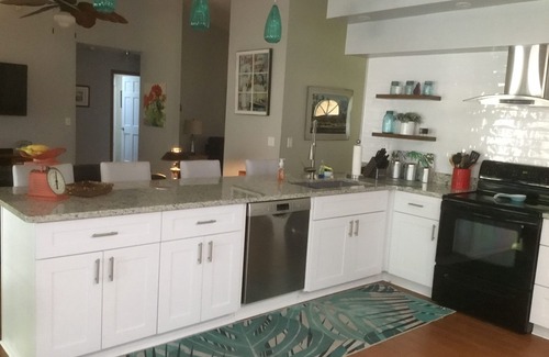 Gorgeous 3 bedroom 2 bathroom Florida home within perfect distance from the theme parks, beaches, and natural attractions! Just 45 minutes from Disney and 30 minutes from both Universal/I-Drive and some of Florida’s most beautiful beaches, this home will provide the tranquility of leisurely Florida life and access to all of Florida’s top attractions, restaurants, and nightlife. Freshwater and saltwater fishing with boat access and rentals is within 20 minutes. This home is beautifully furnished and spacious with 2300 ft of living space, a huge furnished patio deck, stunning pool, garage, and fenced in yard on corner lot. The circular drive allows plenty of room for parking cars, boats, and provides easy access to both front and back entries. The spacious kitchen (LOTS of cupboard space!) is adjacent to a lovely, open living area with big screen TV (cable AND wi-fi are included!) and plenty of seating. A Keurig coffee maker is provided along with a starter kit of coffees and teas to help start you up in the mornings. There is also both a formal dining room and a separate living room with a queen sleeper sofa. Step through the huge master bedroom with king bed and open French doors to enter the spacious master bath, with garden jacuzzi tub, walk-in shower, and large walk-in closet! This home is built for comfort and perfect for entertaining! An ADT alarm system provides total security for your stay. For those who just can't leave their furry friends at home, this property IS PET FRIENDLY with reasonable limitations. Located just a couple minutes from Interstate 4, it’s a perfect location to explore not just the parks, but the beaches, natural beauty, and history to be found in sunny Central Florida!