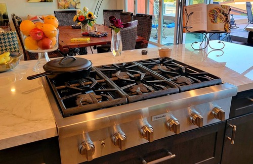 The newly remodeled stadium kitchen is a true chef's delight with state of the art ovens offering steam, convection and pizza options. A 6 burner Thermador gas cooktop with true simmer. Kitchen also has a well stocked condiments and spices. On the opposite end of the open great room is a full size wet bar to inspire any mixologist.