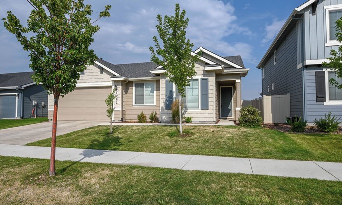 Built in 2021, this single story home is situated in a quiet neighborhood. Home features a split bedroom layout with master on one side and second bedroom plus an office on the other side. House is super cute and comfy and has everything you need with grocery shopping and restaurants in the immediate vicinity. Hospitals located nearby in Meridian, Boise and Nampa. Open floor plan plus huge backyard.