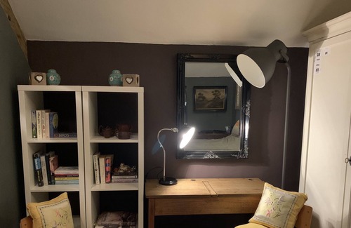 Private bedroom & bathroom, situated in the old part of a pretty cottage, separate to the owners. The visitor's entrance is into a lounge area, which is free to use if wanted, with TV, seating and books to read. Bedroom with king-sized bed, desk, lamp and wardrobe, books on shelving. Large shower room with basin and toilet. Area with kettle, coffee machine, fridge & microwave. Outside; courtyard with seating. Parking is along the wall to the right of the drive, on a quiet no-through road.